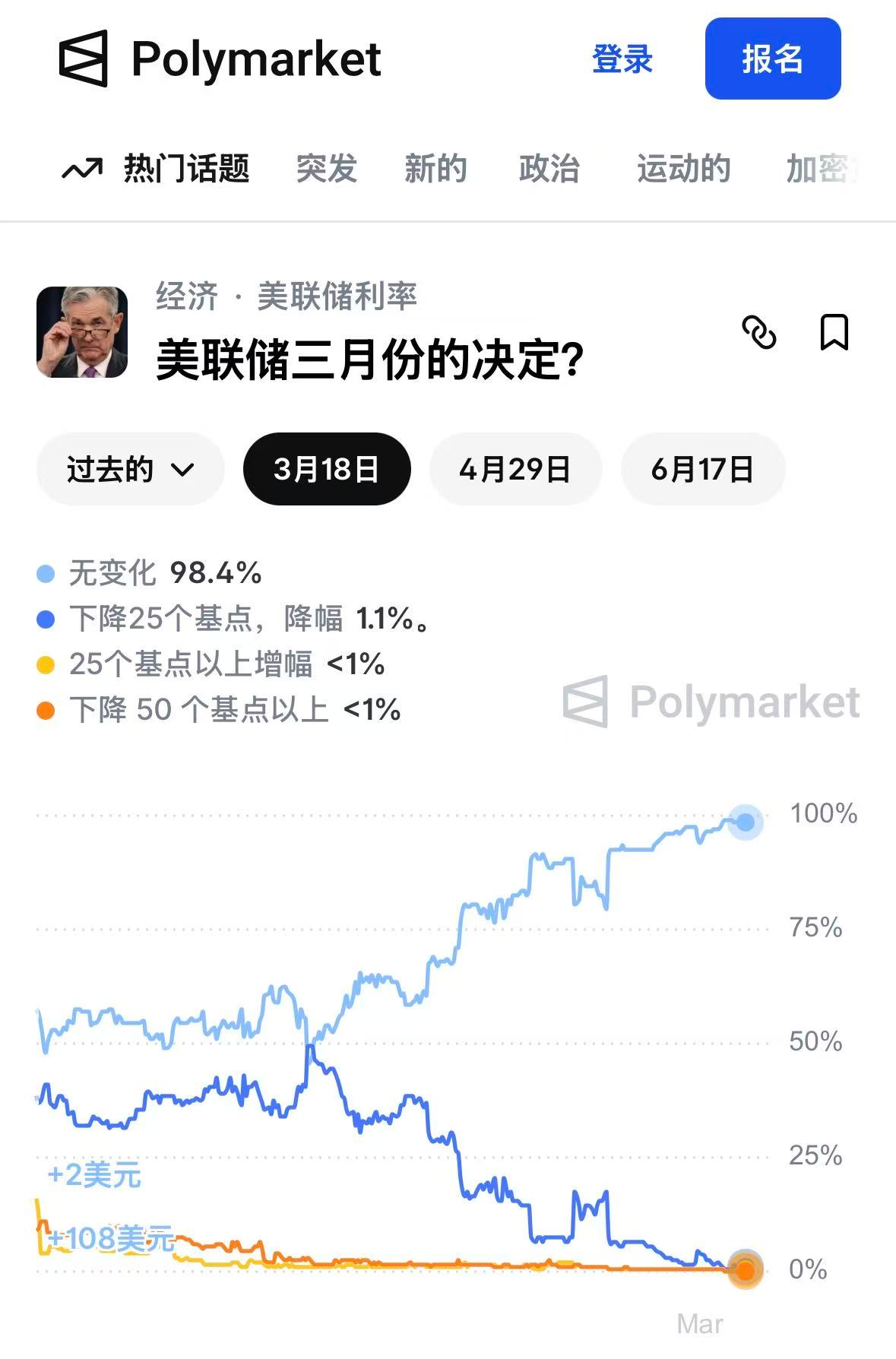 3月9日,截至发稿,市场预测平台polymarket数据显示,美联储3月降息的概率小于2%,4月继续维持利率不变的概率高达85%,6月维持利率不变的概率为57%。