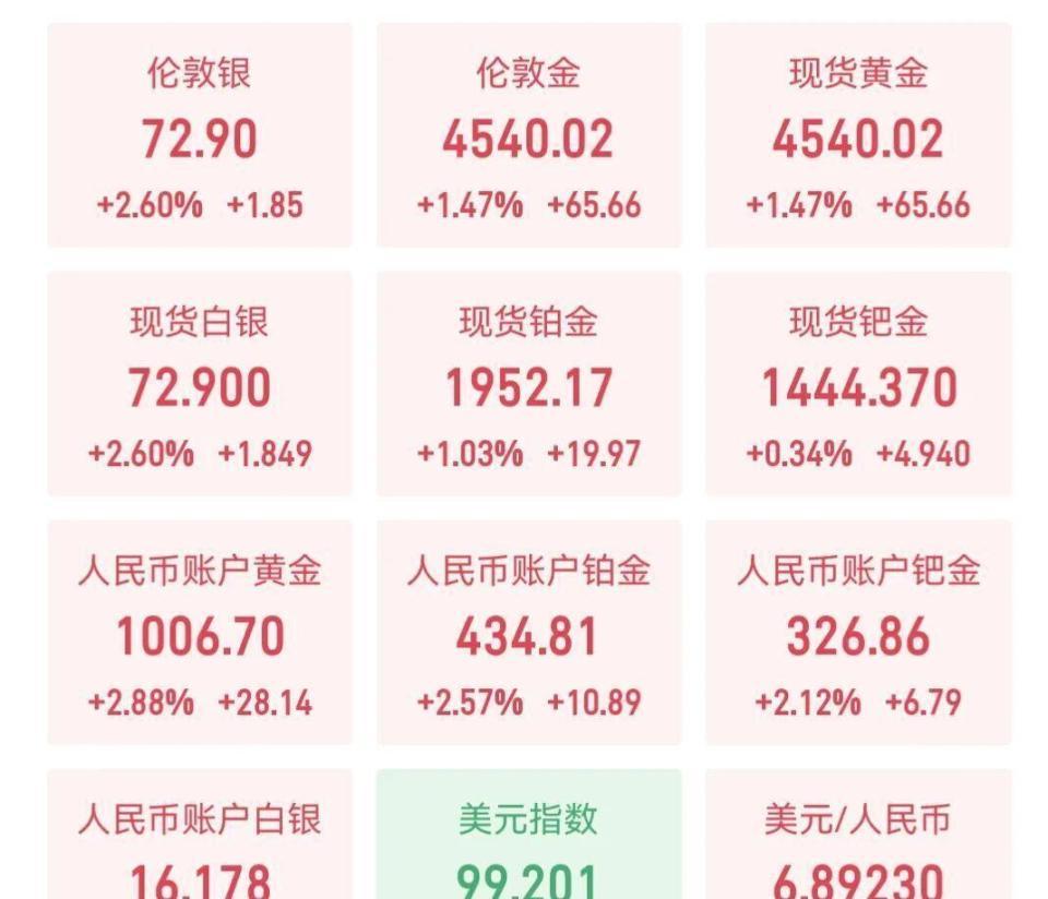 伦敦金稳稳站上4540美元,白银更猛,涨幅超过2.6%。 贵金属市场一片飘红,好像上周那场惊心动魄的暴跌从未发生过。